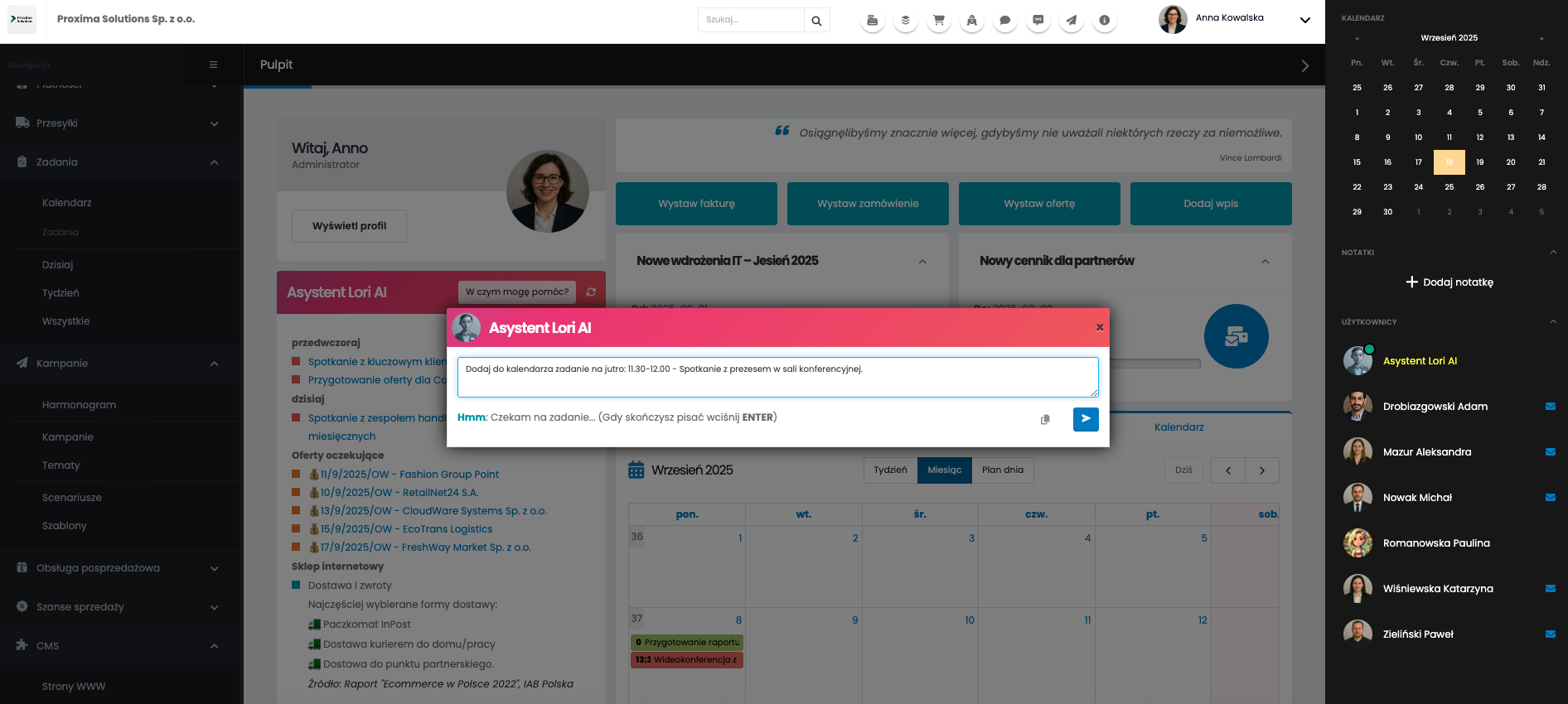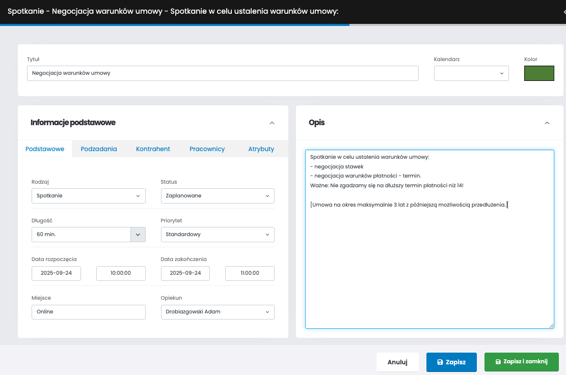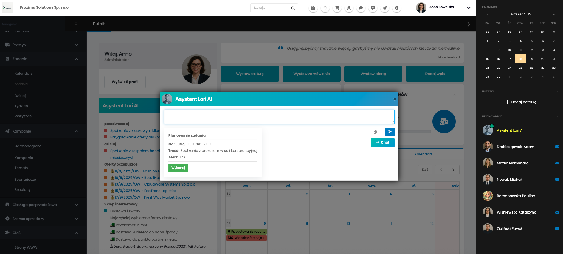 Taki sposób pracy sprawia, że zarządzanie zadaniami w zespole staje się przewidywalne i transparentne. Handlowiec może przekazać zadanie asystentowi (np. przygotowanie oferty), a kierownik działu widzi na bieżąco postęp realizacji. System pilnuje przypomnień automatycznie, więc ryzyko przeoczenia czegokolwiek spada praktycznie do zera.