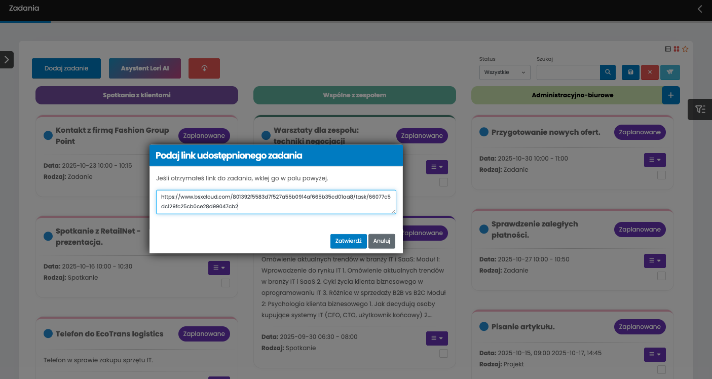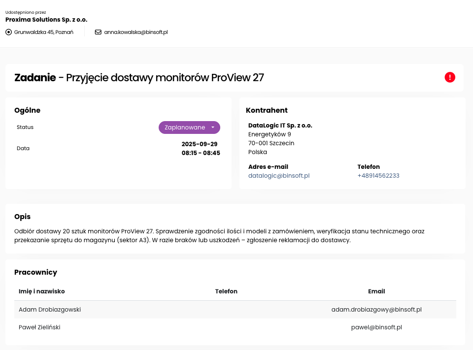 Zdarza się, że współpraca wykracza poza granice Twojej organizacji. Jeżeli Twój kontrahent również korzysta z mpCRM Online, możesz udostępnić mu zadanie bezpośrednio w systemie. Obie strony pracują wtedy na wspólnych danych, widząc ten sam status i te same szczegóły.
