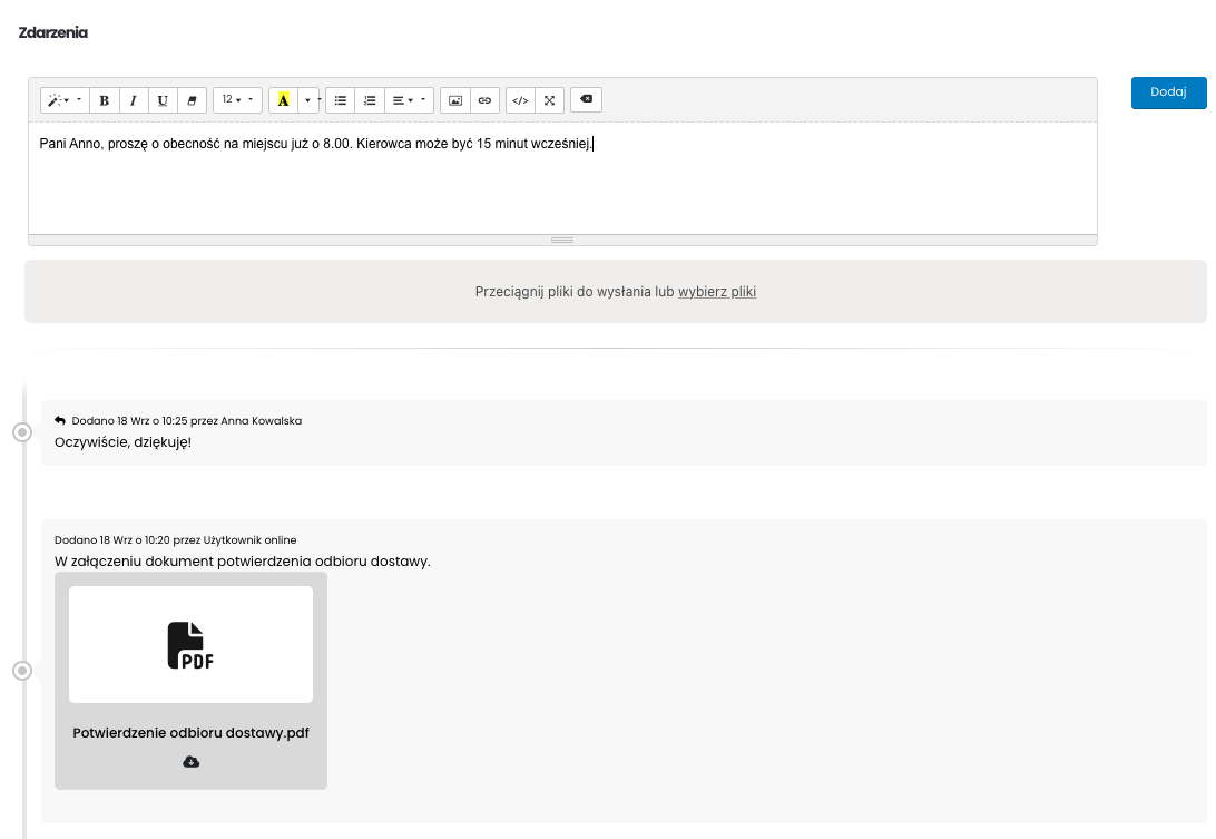 W efekcie współpraca staje się przejrzysta nawet wtedy, gdy część zespołu pracuje poza Twoją organizacją. Przykład? Grafik-freelancer otrzymuje link do zadania z opisem projektu i datą oddania. Nie musi się logować – widzi wszystko od razu i wie, kiedy oddać gotowe materiały. Co ważne, grafik może także dodawać zdarzenia do tego samego zadania. Ty również masz taką możliwość. Dzięki temu możecie na bieżąco wymieniać uwagi, dopisywać informacje oraz przekazywać pliki za pomocą załączników. Cała komunikacja odbywa się w jednym miejscu, co eliminuje potrzebę przerzucania się e-mailami.